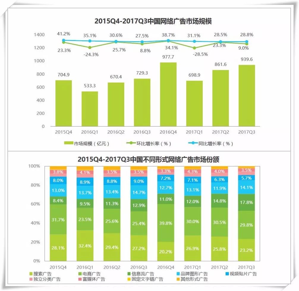 据艾瑞网《2017Q3中国各形式网络广告市场规模》报告显示,2017Q3网络广告市场规模达到939.6亿元,同比增速28.8%,信息流广告占比超过17%。继续保持高速增长。