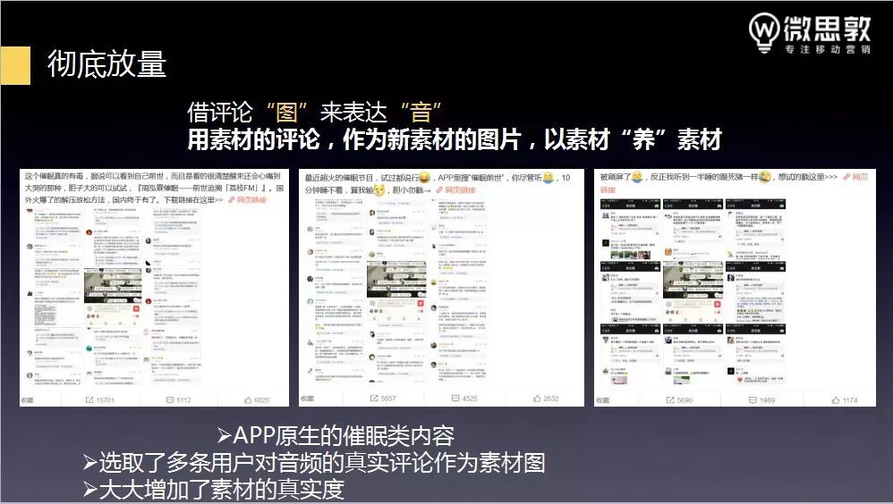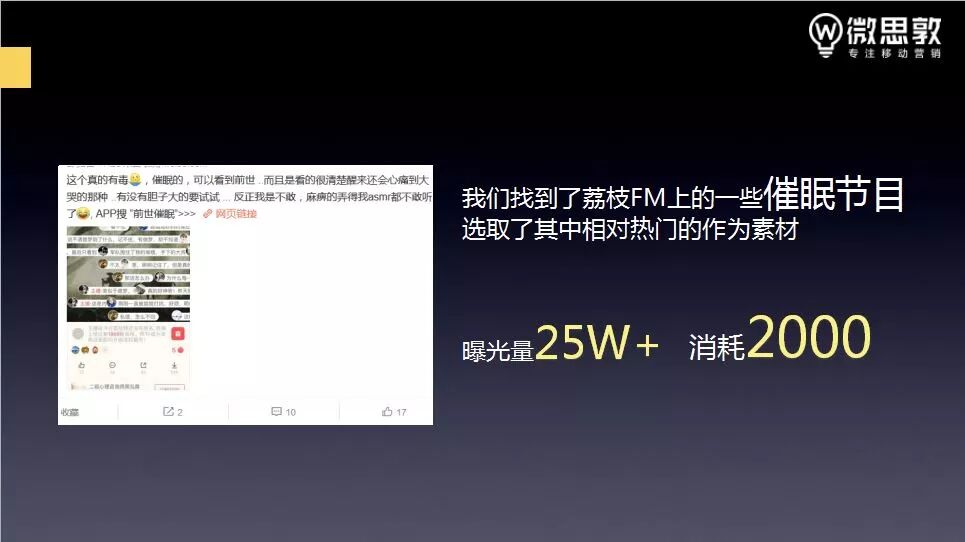 微思敦移动营销运营总监王贺作为资深超级粉丝通优化师,服务过携程、百度糯米、良品铺子等客户,他这次分享主题是《用户裂变背后的逻辑思维》。王贺以微博渠道为例,分享了用户裂变传播的方法,他指出在推广过程中,微博内容能够进行转发,容易形成二次传播,达到用户裂变的过程。 王贺以荔枝FM在微博推广为例,分享了如何通过用户人群分析、使用场景、内容等方面提升素材质量,达到高效传播转发的效果。 他认为,推广素材需要总结用户喜欢传播的素材共性,复制逻辑进行推广。针对转化效果不佳的问题,王贺也提出了应对的方法,通过借助用户评论第三方的表达方式来表达效果,用素材的评论,作为新素材的图片,以素材“养”素材。 提升内容用户转发参与是用户裂变的重要步骤,“什么样的内容用户愿意参与转发?”,对此问题,王贺认为用文案框选群体,点出重要信息,减少用户的判断成本,从而有效的提升用户参与度,达到用户裂变的效果。 王贺以及其他三位嘉宾的分享为现场的观众带了极大的启发,现场观众积极提出自己的疑问与困惑,四位嘉宾也从专业的角度,就其中的一些问题与分享嘉宾展开热烈讨论,将互动环节推向高潮。 微思敦移动营销与热云数据的本次合作圆满成功,本次分享会就如何实现用户增长这个问题提出相应的运营方法与推广策略,整个分享会通俗易懂,生动有趣,到场的各位都表示受益匪浅。未来,微思敦移动营销和热云数据将会开展更多合作与活动,敬请期待!