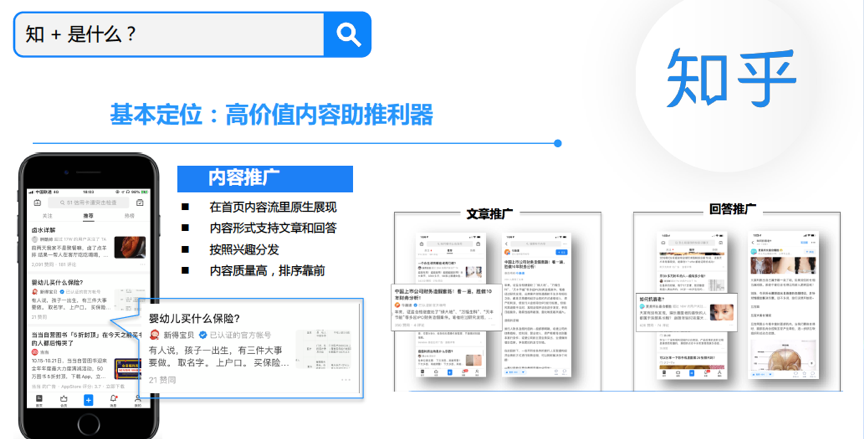 简单来说,就是知乎站内原生的问答或文章内容,通过知+,在用户的首页推荐内容流里边进行原生展示,和自然内容推荐展现形式上没有区别,并为有知乎机构号的企业或知乎账号的个人提供服务。