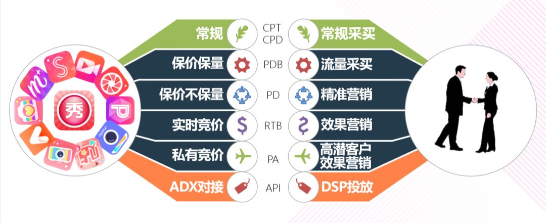 美图程序化平台是针对美图旗下五大核心APP-美图秀秀/美颜相机/美妆相机/潮自拍/海报工厂,整合多种广告资源的一站式效果广告投放平台。不仅可以在一个后台同时投放五个APP内的广告,而且通过后台的数据标签进行精准化投放,满足了用户群体细分的个性化需求,对于效果类客户适配度极高。