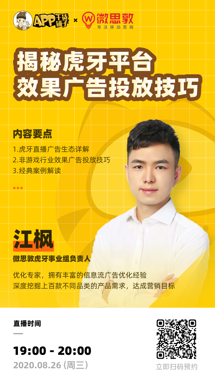 8月26日19:00,微思敦虎牙事业组负责人——江枫受邀到APP干货铺子做客直播,爆量广告投放案例分享请锁定今晚APP干货铺子直播公开课!