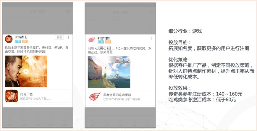 游戏客户一直是广告投放的大户,陌陌上长期投放的吃鸡游戏成本低于60元一个激活,传奇类的游戏注册成本在是140~160元区间。