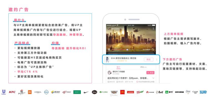 邀约广告是与UP主商单视频紧密贴合的效果广告,将UP主 商单视频推广内容与广告位进行结合,观看UP 主商单视频的同时即可实现导流跳转、种草带货。其具有如下的价值:导流跳转、提升转化ROI,如图所示,目前B站的合作客户有联合利华、麦当劳、肯德基等。