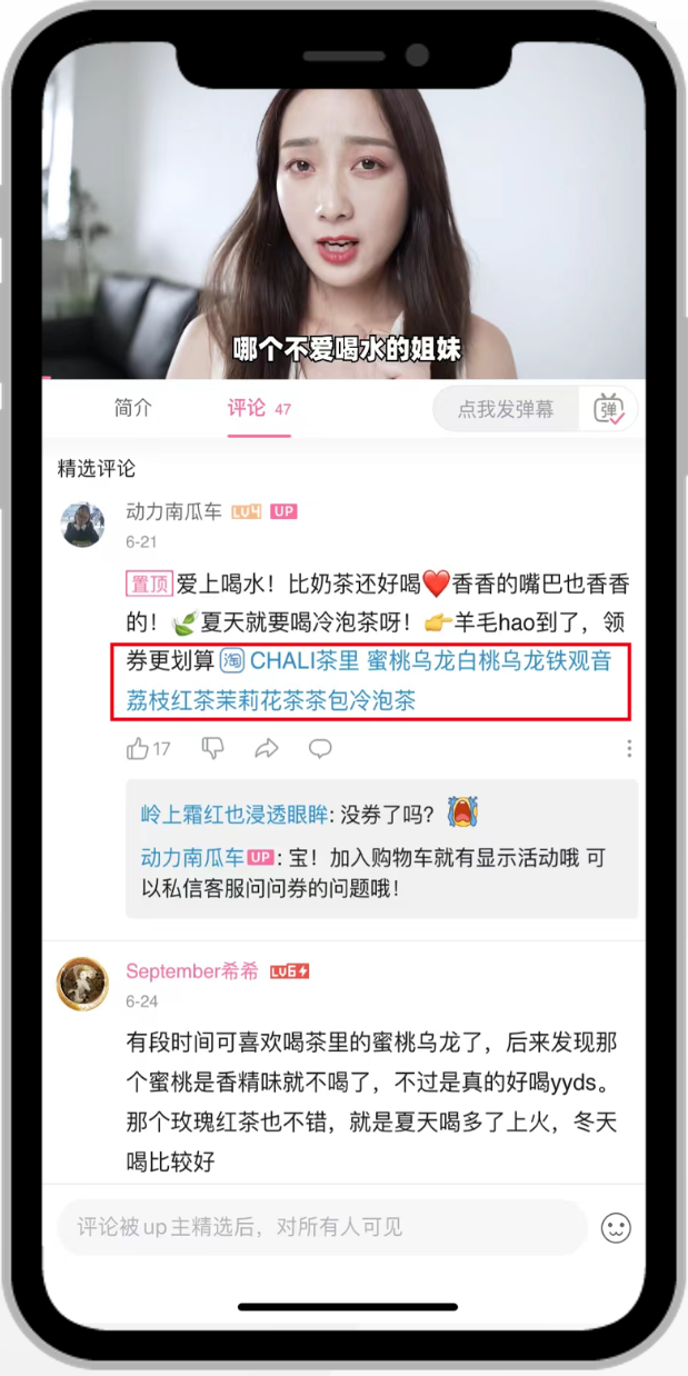 UP主在合作花火商单后,视频评论区可以开启蓝链功能,会置顶一条“蓝色商品链接”,UP主再通过评论置顶和文案编辑,吸引用户点击。