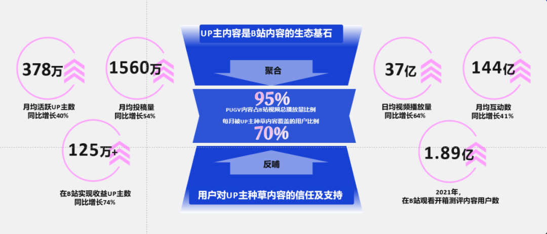 优质的UP主生态是B站最宝贵的财富,以兴趣驱动UP主专业内容创意种草构筑B站内容“护城河。据B站官方统计,每月被UP主种草内容覆盖的用户高达比例70%。