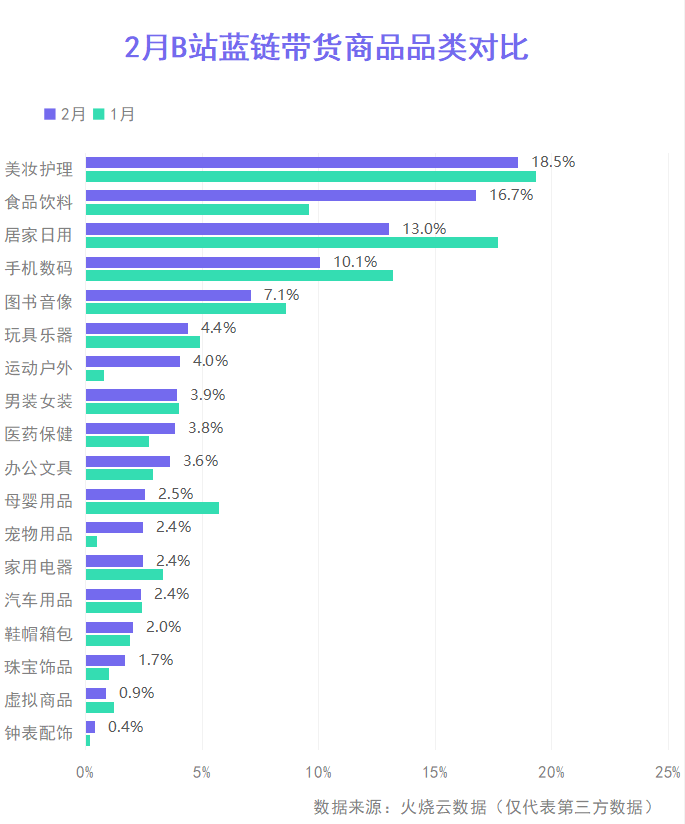 2月B站蓝链带货领跑三大品类是:美妆护理、食品饮料、居家日用,分别占比18.5%、16.7%和13.0%,相比于1月份,居家日用类占比有所下降,但食品饮料出现了较大的提升。