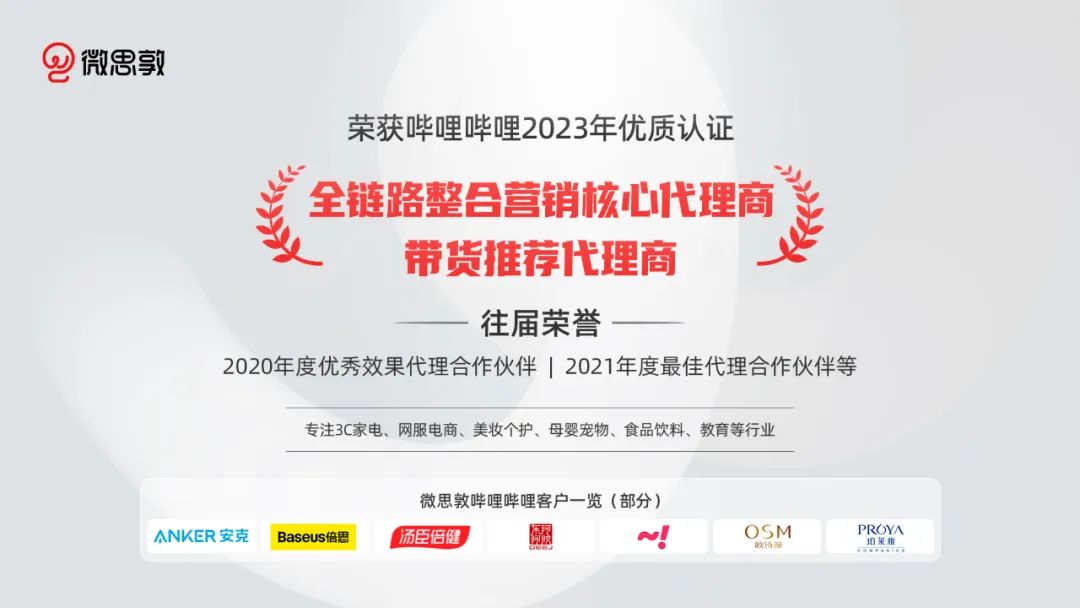 微思敦作为深耕B站多年的深度合作伙伴,近期再次被官方优质认证为带货推荐代理商、全链路整合营销核心代理商。名单详情→2023年初公示丨哔哩哔哩优质代理商名单