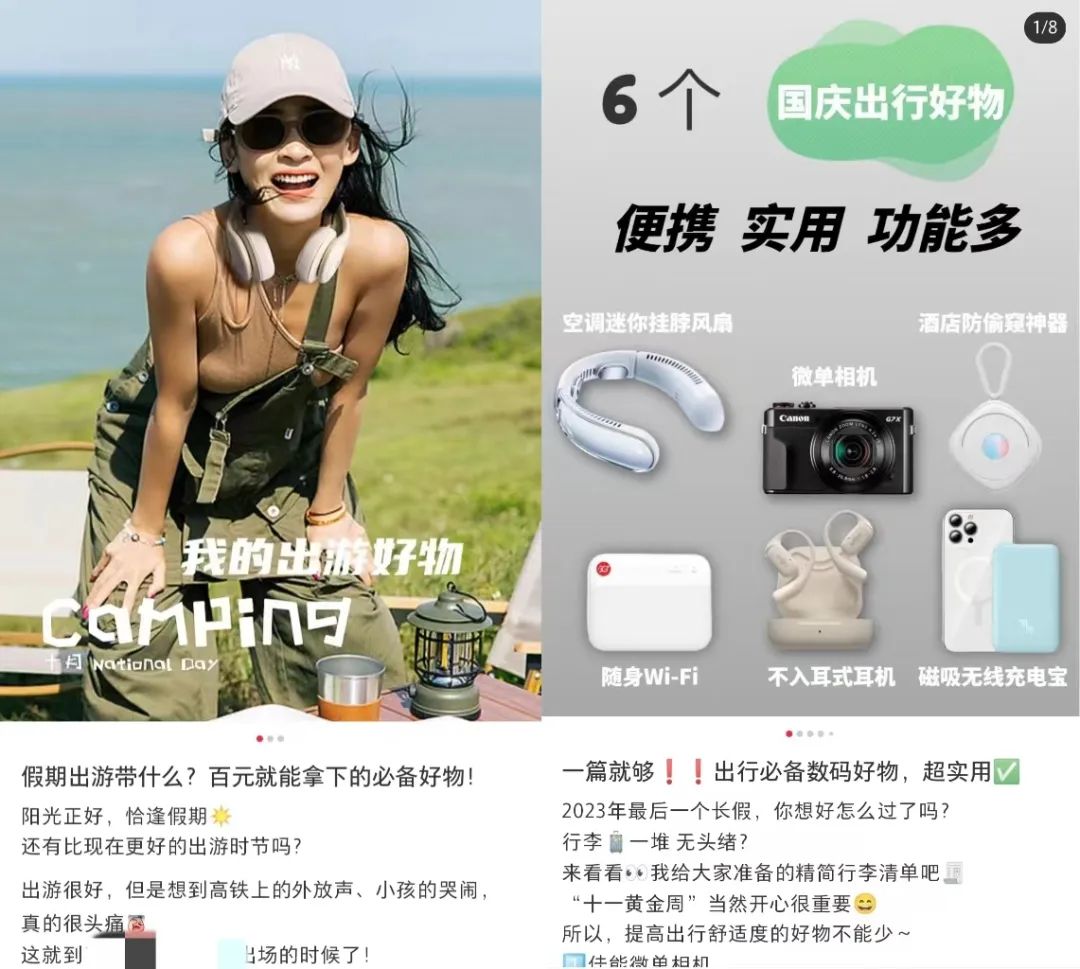 1、国庆出游3C好物:今年国庆连着中秋放8天假,这么长的假期免不了亲朋好友齐出游,3C品牌可以将所有适宜出游的产品来一一推荐,组成一篇合集内容,展示产品的功能性特点,以“国庆出游必备”为主题来填充内容,为用户想到方方面面。
