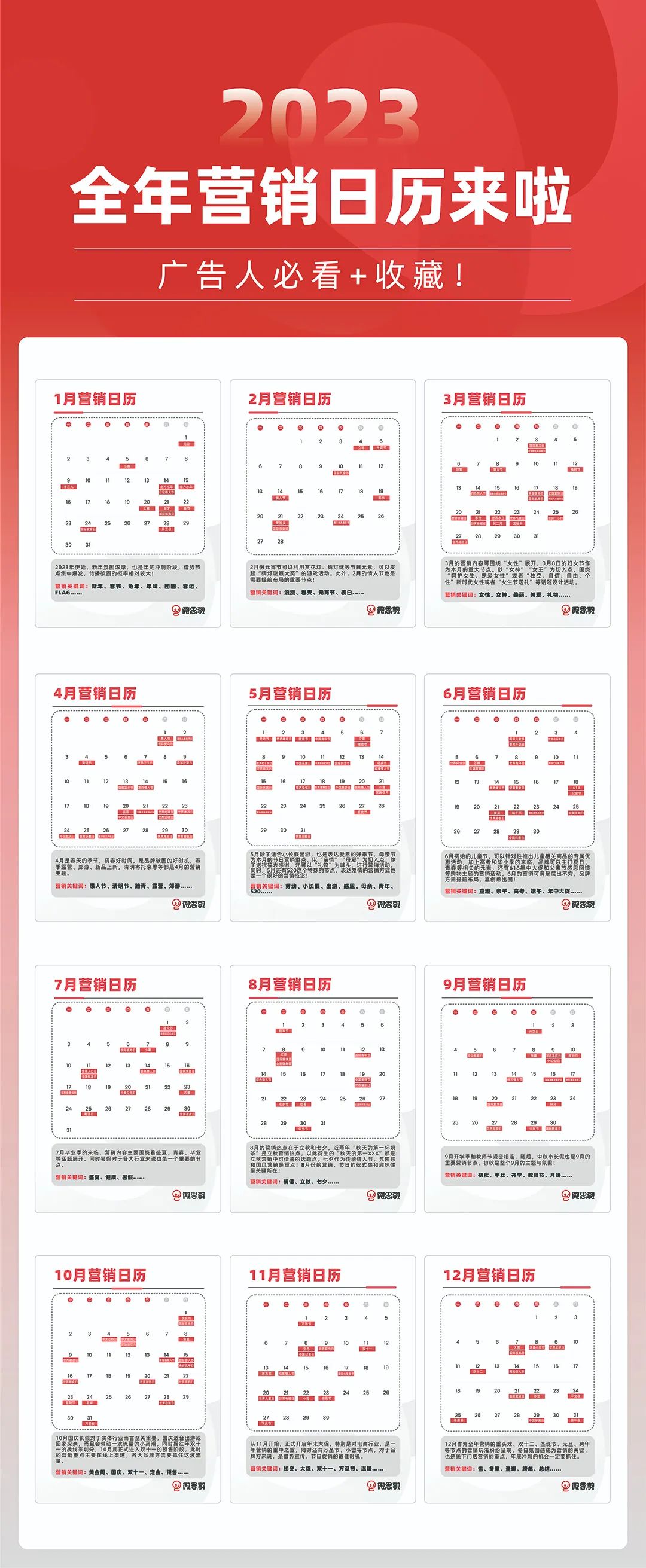 此外,我们还给大家整理了2023全年的营销热点日历,共包含大小500个营销节点,每月更附加了借势建议营销关键词,关注微思敦公众号,后台留言回复关键词「2023营销日历」免费领!微思敦营销热点指南月度更新中,咱们下月见!