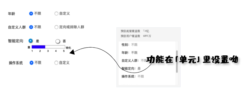 「智能定向」产品是在原有定向的基础上,通过智能算法模型,提升广告曝光的精准度或曝光量的智能定向工具。 「智能定向」产品解读 一、「拓量」定义解读 帮助广告主进行自动化的定向选择,依托定向模型算法帮助广告主探索更多精准的目标受众,降低广告主定向探索的成本。 二、「效果」定义解读 通过智能算法,根据平台上全部的投放数据,确定符合某个单元定向的受众人群,进行智能地定向选择。 产品分级详细说明 「1级」对成本要求较宽松,对流量需求迫切,定向尽量放宽,活动预算客户更适用; 「2级」现阶段成本已达标,对效果考核压力较小,想增加曝光的客户更适用; 「3级」对定向不能精确选择,对成本与流量均需兼顾的客户更适用; 「4级」现阶段流量需求已达标,有一定量级的数据回传,对成本有收紧意向的客户更适用; 「5级」当前投放成本远高于预期成本的客户更适用,建议适当提高出价,增加曝光机会,系统将筛选出那批转化率最高机会的参与竞价,通常会降低总消耗、提升转化率。 产品上线案例 「某网服社交客户」使用智能定向前,成本较高,且不稳定,使用智能定向后,提高出价,成本降低且趋于稳定,转化量提升。 「某交通运输客户」使用智能定向之前该单元转化量极低,使用智能定向后,成本降低,且有稳定转化;后期提升出价,从而提升转化量。