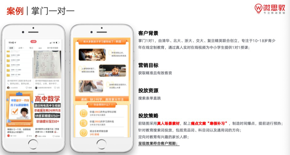 投放策略:前链图采用真人场景素材,配上痛点文案“寒假补习”,制造时间爆点,提前进行预热;针对教育搜索词投放,包括竞品词、科目词以及通用词的方向;定向对教育有兴趣的家长人群。