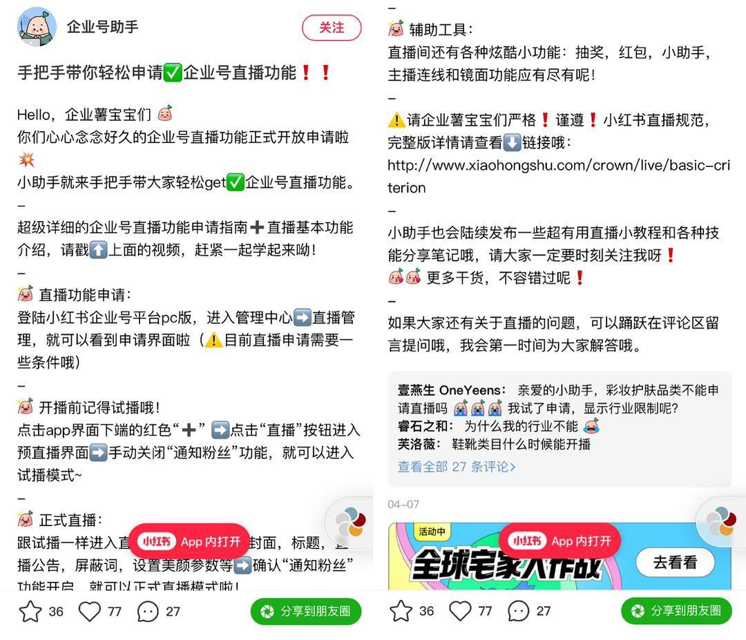 为何国际知名高奢品牌的直播变成了一场闹剧,成为众嘲的对象?是平台选择的不对吗?作为“年轻的生活分享平台”的小红书其实早在3月24日便开通了首场直播进行小红书带货直播功能的介绍,其新人主播和企业号直播的规则如下: