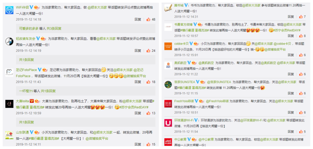 一个好的活动仅仅依靠自身平台还远远达不到较大声量,你需要一股背后的力量——品牌联动。活动期间由年丰大当家提供大闸蟹作为活动奖品,邀请了几十家蓝V参与,在官微发布的第一时间,各品牌按要求带话题及统一文案整齐且有秩序的转发,通过”1+N”的蓝V矩阵传播模式,为扩大活动的传播打下了坚实的基础。