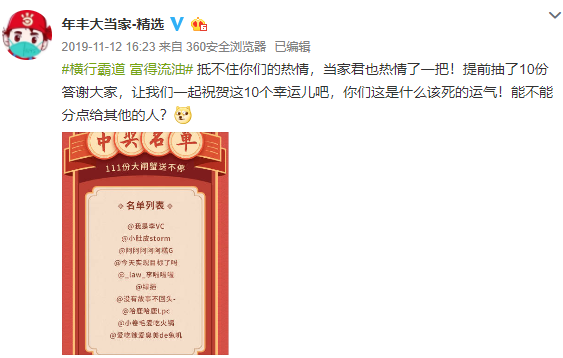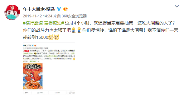 在这期间,电商生鲜品牌年丰大当家在微博发起了一场上万人转发的活动,在无任何推广的前提下,打造爆款级活动,话题阅读量飙升300W+。