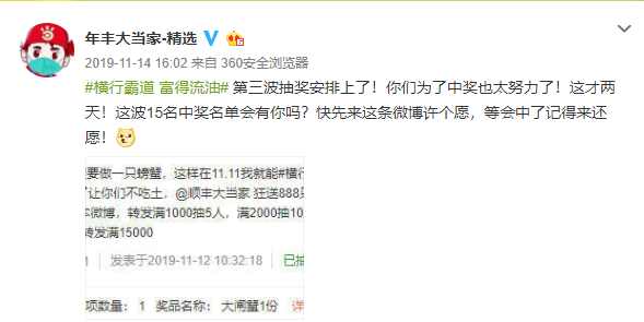 人类的天性是爱游戏的,而抽奖是游戏最简单的形式之一。在活动高潮阶段运用转发抽奖机制,轻松激起用户的“爽点”。品牌只有抓住与用户的共同利益点,找到巧妙的沟通时机和方法才能将双方紧密的结合起来。