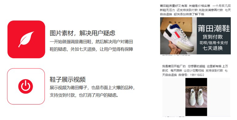 想必莆田鞋大家都不陌生,那么莆田潮鞋想要推广,最大的痛点就是要打消用户的疑虑,也就是从产品详情到服务推广的流程详细展示给用户,因此这样的客户在素材制作和上广告的时候,就要注意痛点文案的运用,例如上图“价格实惠”、“一个月买几双毫无压力”、“支持货到付款”等文案就十分吸引用户,转化效果也很好。