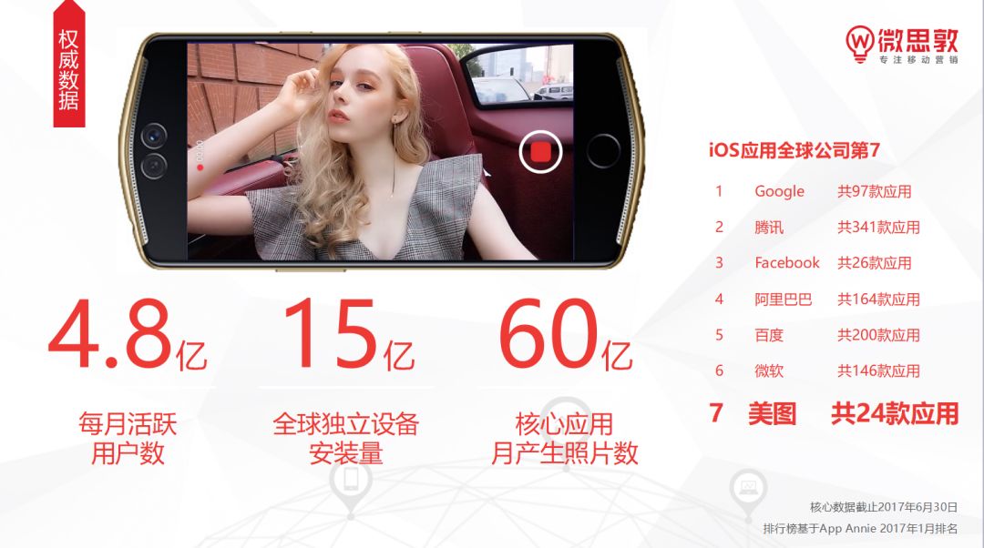 目前美图的影像及社区应用矩阵已在全球15亿台独立设备上激活,月活跃用户总数为4.8亿,聚合美丽平台11个,美图月度视频播放量为79亿次,月度总使用次数达67.4亿次,月度总使用时长可达97.3亿次,尤其在节假日期间,美图活跃用户达6700万/天,用户在线时长可达4100万分钟/天。