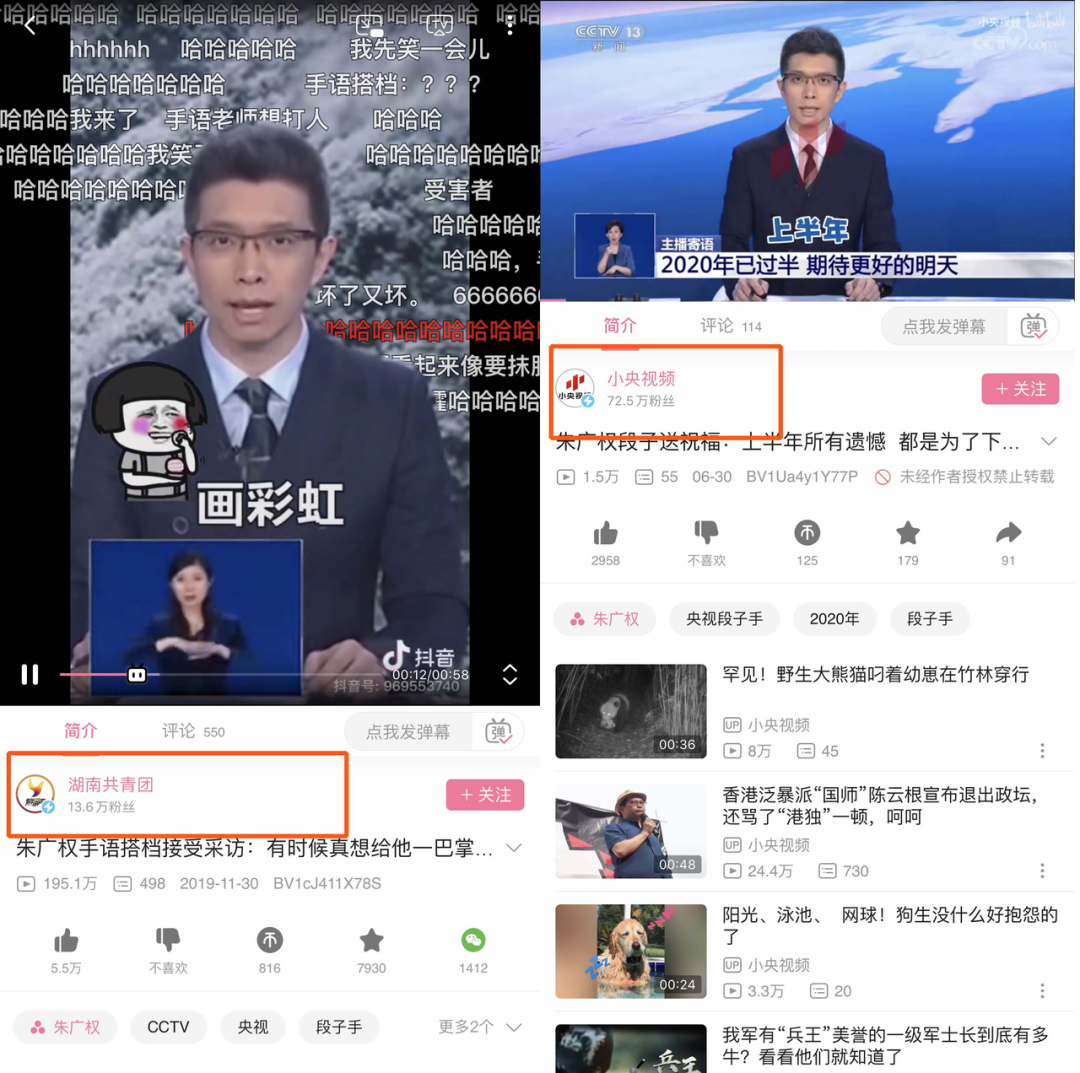 第二,B站早已成为品牌出圈的胜地,B站蝉联两季度年轻人最喜欢APP的宝座背后是“认真对待每一个年轻人”的坚持。不知道大家还记得“小朱佩琦”组合里的小朱吗?作为手语老师最不想合作的主持人,其不仅在B站有自己的视频,还有专门的up主剪辑鬼畜视频,著名的男团“康撒朱尼”也是在B站正式出道的,当然包括小央视频、湖南共青团等在内的知名up主,也利用视频的方式让朱老师稳坐“打造佛山无影手手语主持”的宝座。
