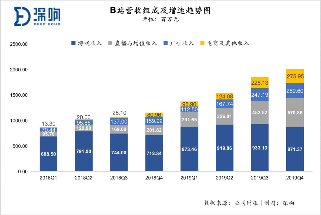 要说B站有什么,可能只有你想不到没有你找不到,根据深响《2019年B站营收组成及增速趋势图》显示: