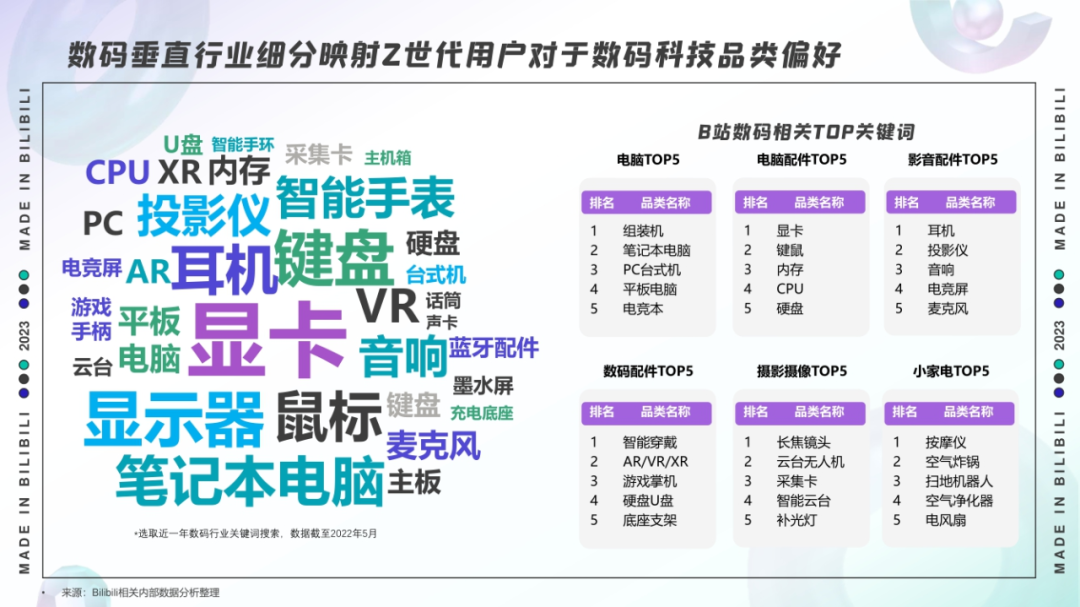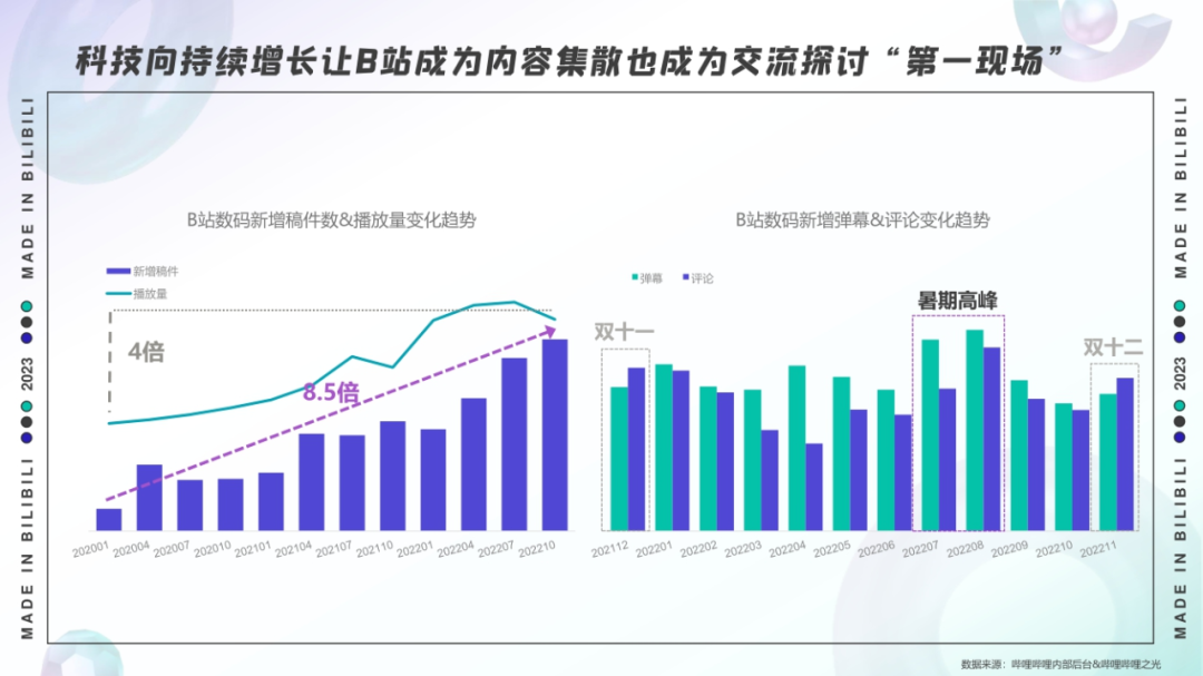 同时,ACG基因浓厚的B站,“数码控”玩家的“浓度”更是不低,从2020年至2022年,B站数码新增稿件数增长8.5倍,每逢双十一、双十二、暑期、开学季等时间段,其相关内容互动热度就会迎来高峰。