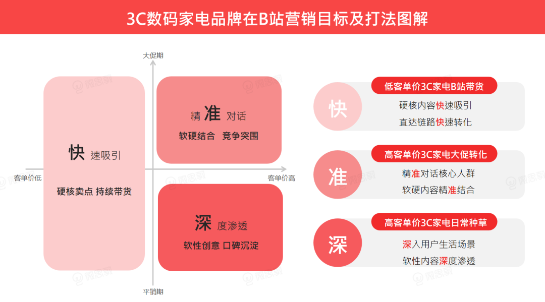 根据客单价高低与大促、平销期的不同,我们可以划分出B站种草的打法四象限,通过“快、准、深”三种不同玩法,更为精准高效地触达用户,提高转化。