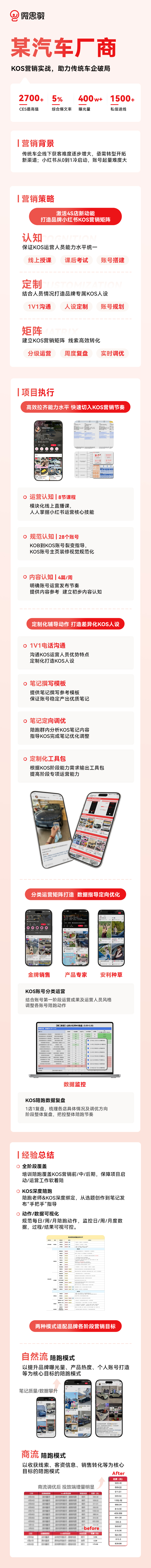 微思敦在接到某汽车厂商小红书KOS项目后,针对账号冷启动难、线下获客成本攀升的双重困境,建立起一套“培训+陪跑+复盘”的全周期赋能体系。