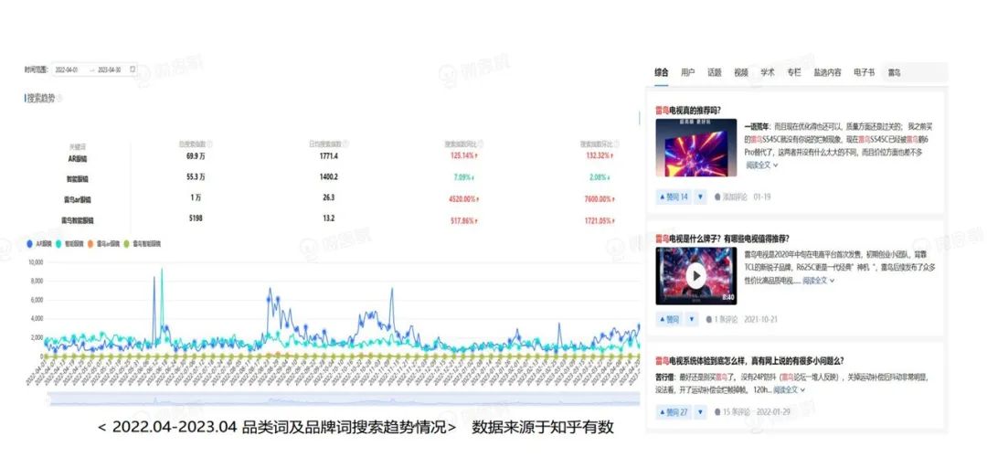 雷鸟智能眼镜在知乎搜索指数偏低,用户对雷鸟的认知还停留在品牌电视系列,智能眼镜还未形成讨论趋势。