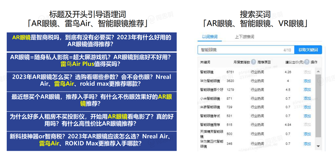 在关键词布局上,严守品牌词【雷鸟/雷鸟智能眼镜等】,进攻品类词【AR眼镜/VR眼镜……】、竞品词【Nreal/Rokid/苹果……】抢先拦截流量。