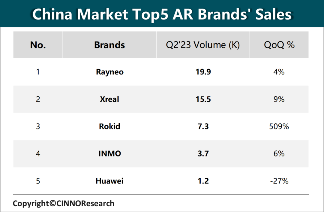 而在CINNO Research今年Q2AR眼镜出货量排名统计中,雷鸟(Rayneo)成功跃居国内市场份额第一!XREAL(原名Nreal)出货量排名第二,Rokid、INMO、华为分列3-5位。