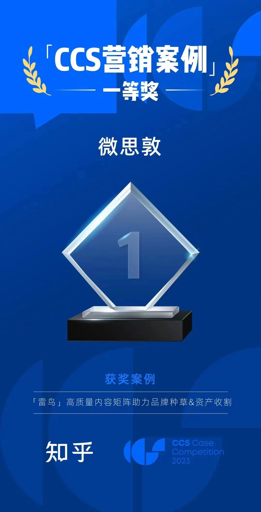 在前不久结束的知乎Q2「CCS新知奖」案例大赛中,微思敦x雷鸟 案例也成功斩获全场一等奖(全场唯二案例),赢得了知乎官方对微思敦的肯定。