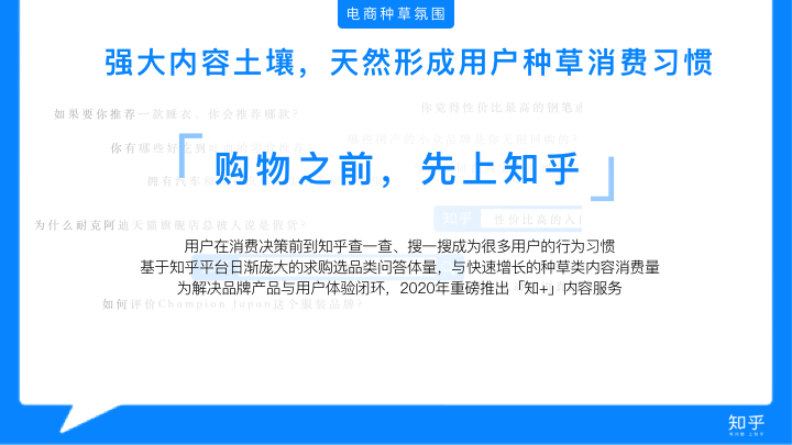 知乎是从社区问答产品为根基逐渐成长起来的,用户在使用产品时场景完全贴合从「种草-拔草」的消费路径。同时,在使用产品过程中培养了「购物之前,线上知乎」的消费习惯,知乎拥有4500万内容量是强大的内容土壤,其中融合大量的电商行业问题和回答。