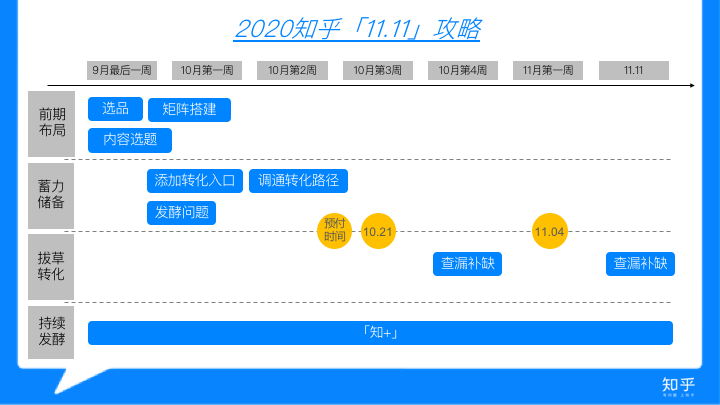上面是知乎「11.11」的内容攻略,简要为大家进行攻略内容的解读,从时间点上步步为营。