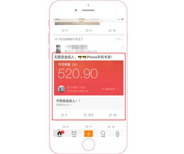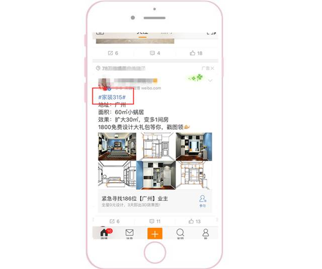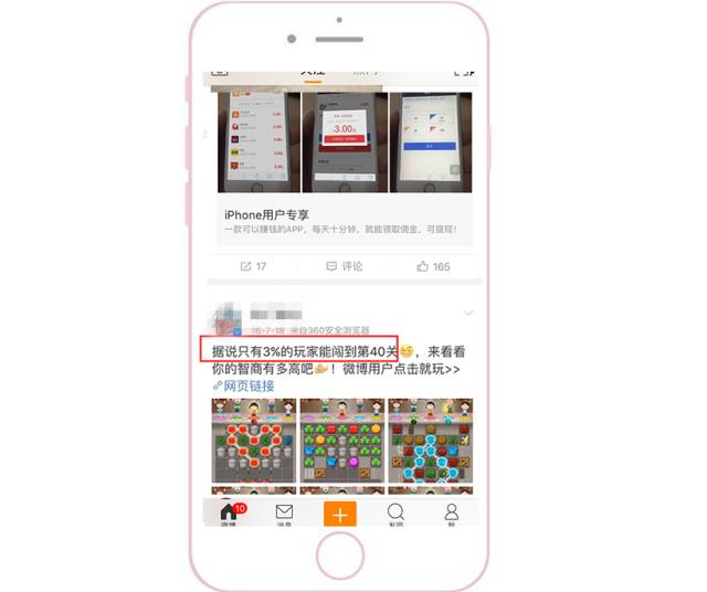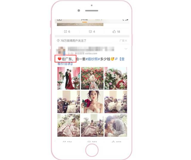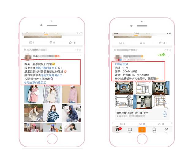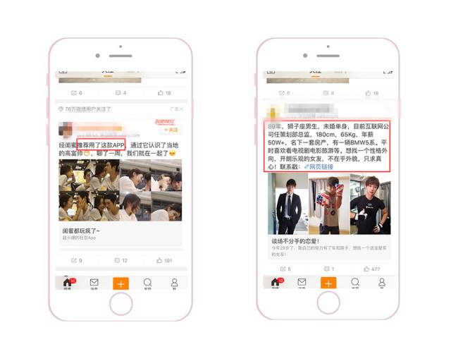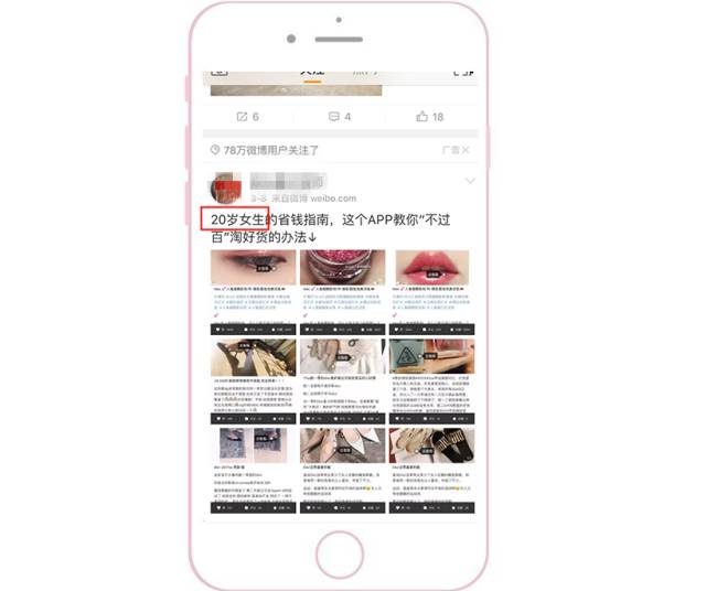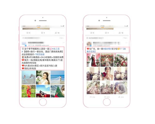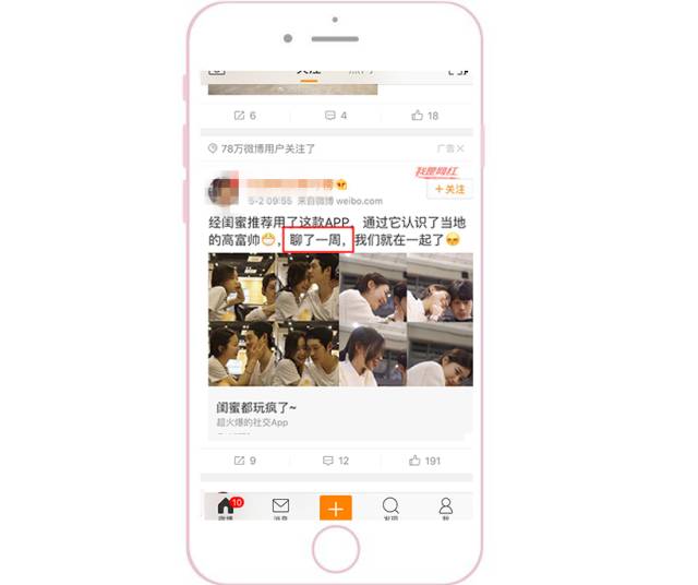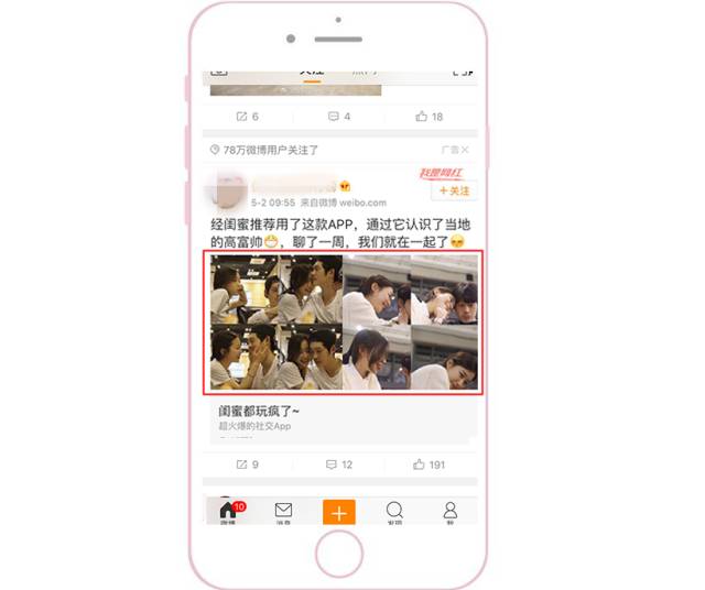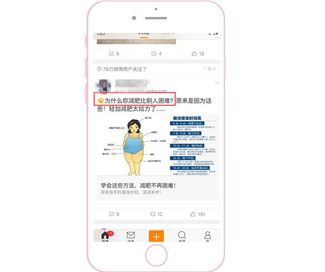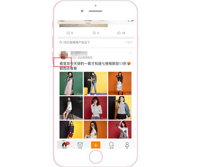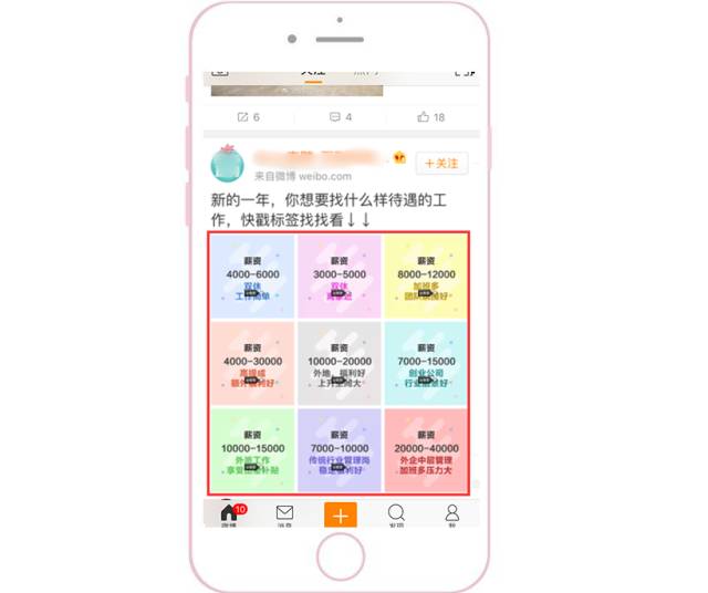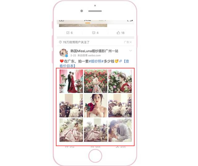 优先侧重配图和视频 因为根据微博用户的浏览习惯,普遍都是先被图片或视频吸引,然后才会去返回看文案。此外,为了能把素材在信息流中更明显地突显出来,要注意与上下两条信息流的配图形成鲜明对比。 1、颜色突显:采用大红大绿等鲜艳颜色。 2、样式突显:采用系统原生界面截图(如直播界面、系统界面)。采用用户熟悉的界面作为配图,会显得更加真实,可以提高用户的对产品的信任度。 采用结果呈现型 把用了这个APP之后能产生的变化和能得到的结果直接呈现给用户。更直观、更可信、更有吸引力。 多图形式给用户选择感 一般APP类型客户采用应用家九宫格的形式,因为每一张图都可以给用户不同的选择,并且每一张图都可以是APP下载的入口。此时,用户就可以根据自己的特点,点进与自己相关的图片去下载APP了解详情。三大配图原则