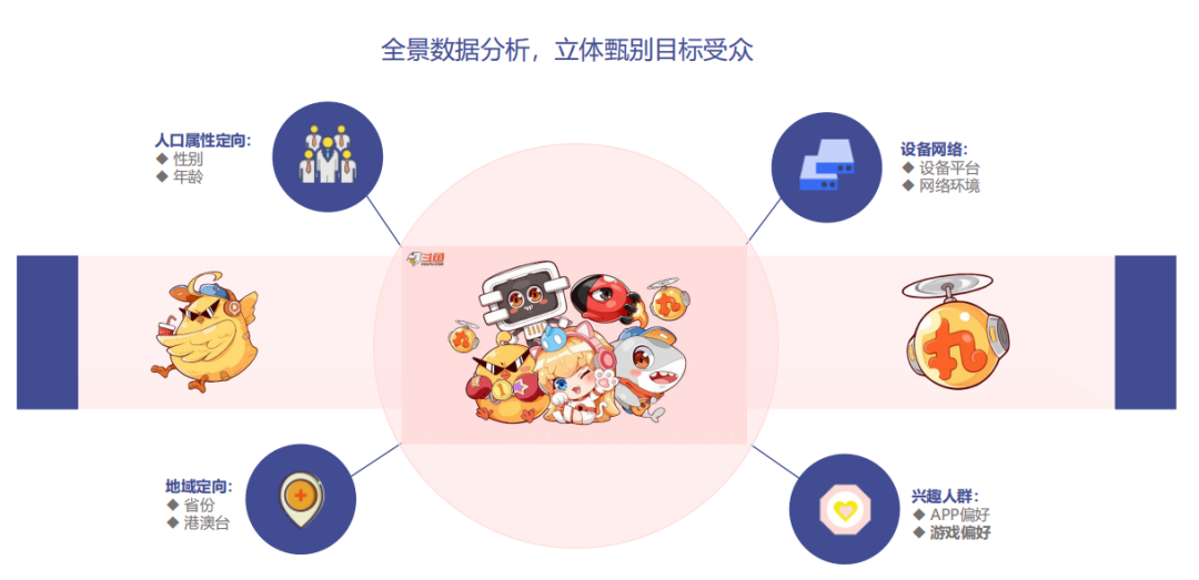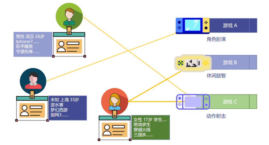 基于斗鱼大数据平台,依托全景数据甄别单一粒度TA特征,高效匹配游戏产品满足精众高效推广需求,同时,向用户推荐更为偏爱的类型产品,实现双向推荐,协同共赢。