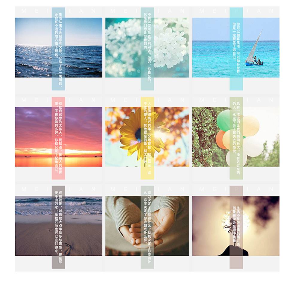 2、九个不同的色块是根据不同的素材图中选取的合适的颜色,所以在整体搭配上很和谐,也能展示九张不同的素材;