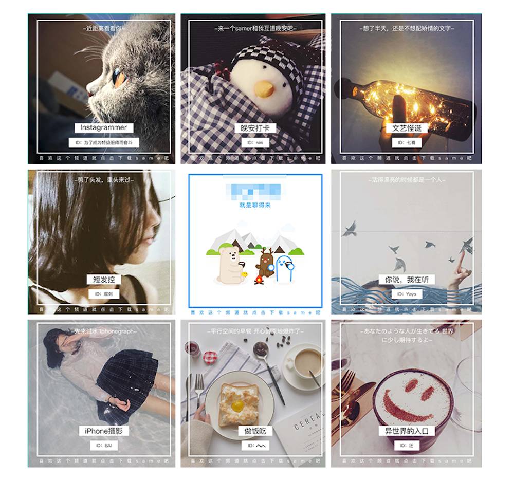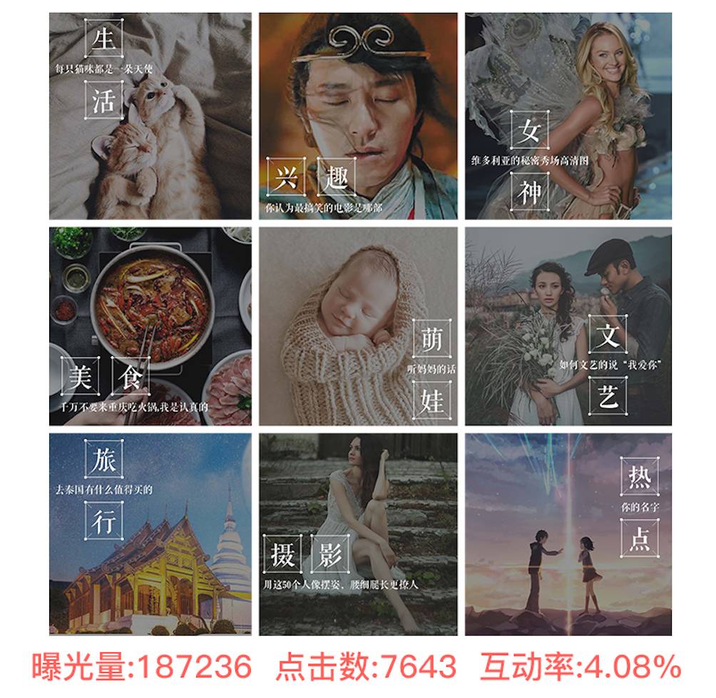 5、该版素材的文案展示了九个不同的版块,都是从APP中选取的,很好的展示了该APP的内容功能,引起网友的好奇和兴趣。