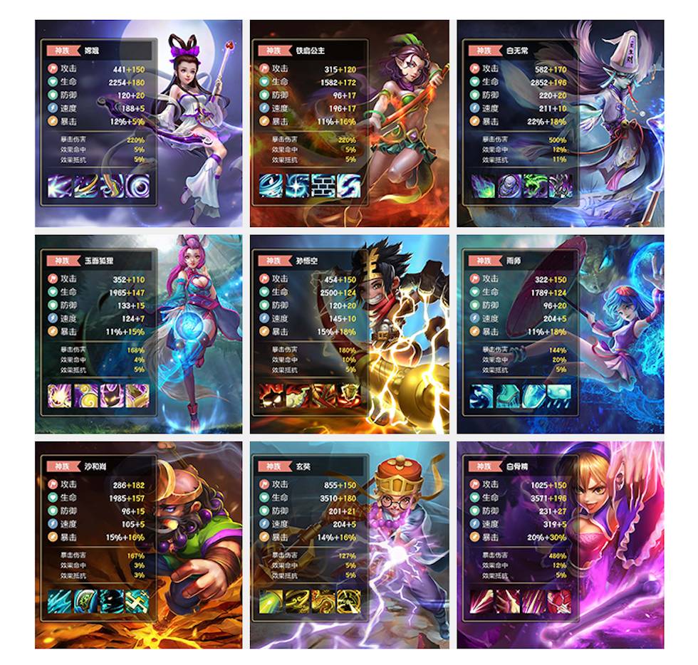 3、人物形象丰满,色彩艳丽,视觉效果好,给人冲击力,九张放在一起,增强气场,达到吸引玩家效果。