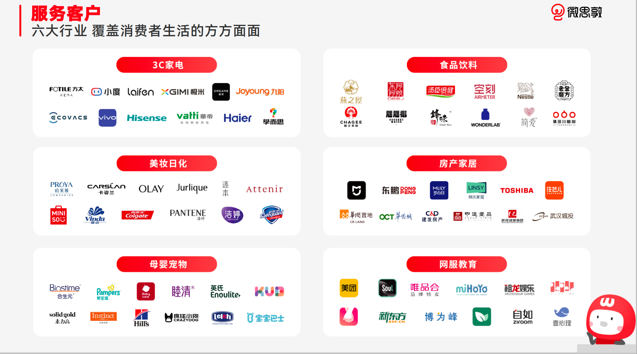 微思敦优势服务行业:3C家电、美妆日化、母婴宠物、食品饮料、房产家居、网服教育,均属于小红书高增长、高爆发力赛道。未来,微思敦也将借势品类增长红利,助力品牌企业实现生意进一步增长。