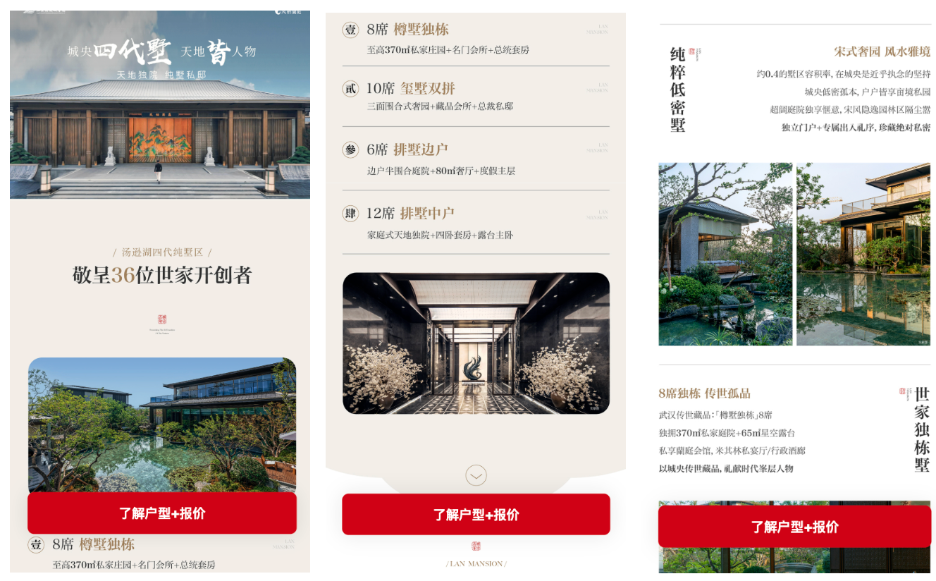 外层创意严格遵循 “所见即所得” 原则,大量运用入户门厅、小区实景、样板间、园林景观等高质量实拍素材,多角度、全方位地直观传递项目的营造标准与居住品质,同时强化城区罕见的超低容积率+ 240%得房率,快速建立高端客群的初步信任与兴趣。