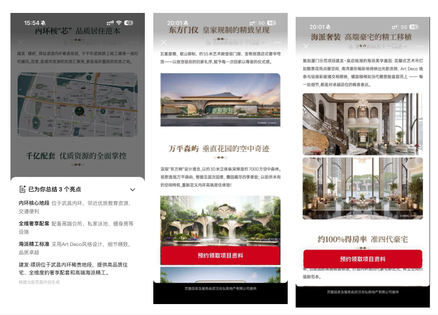 ✧AI赋能落地页:落地页全面展示区位、园林、会所、海派奢装等价值,并采用AI总结功能,一键提炼项目核心优势,适应高端客户快速获取关键信息的需求,提升留资效率。