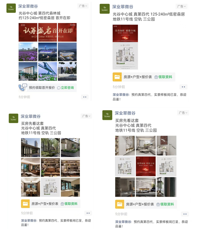 外层创意根据项目的重要营销节点(如开盘、加推)动态调整主视觉,持续保持新鲜感。通过将户型图、样板间实景进行组合,运用9宫格、竖版大图等丰富样式,直观、多维度地释放“低密四代”的核心产品优势,有效吸引对居住品质有更高要求的改善型客户。