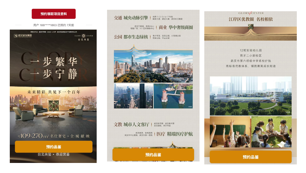 外层创意采用 “系统化视觉百科” 式的沟通策略。通过9宫格、橱窗、竖图、横图的多样化组合,全方位、无死角地展示建筑外景、高阶配套及稀缺周边资源。每一套素材匹配针对性文案,从不同角度深度解读项目价值,共同构建出一个完整且可信的高端生活图景,持续吸引目标客群深度了解。