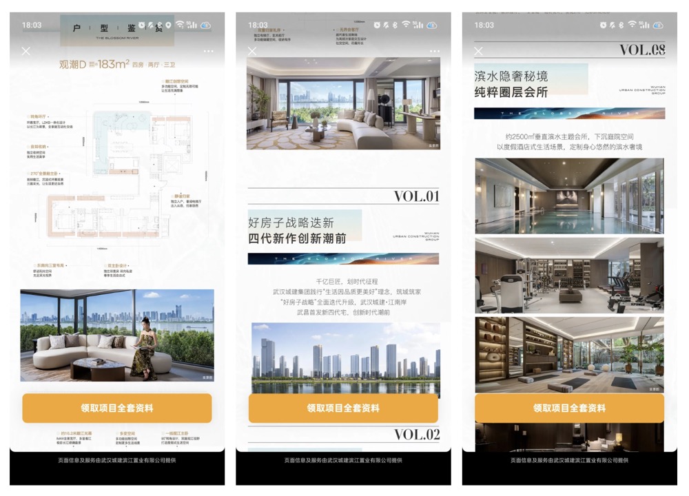 外层创意采用 “概念主K+实景场景” 的组合式打法。通过9宫格、视频、橱窗等丰富样式,将“270°全景舱”的震撼视野、“一线长江”的稀缺景观与“新四代”的户型空间进行立体化、场景化演绎。文案直击核心价值点,并结合重要营销节点更新,持续激发高净值客群的到访欲。
