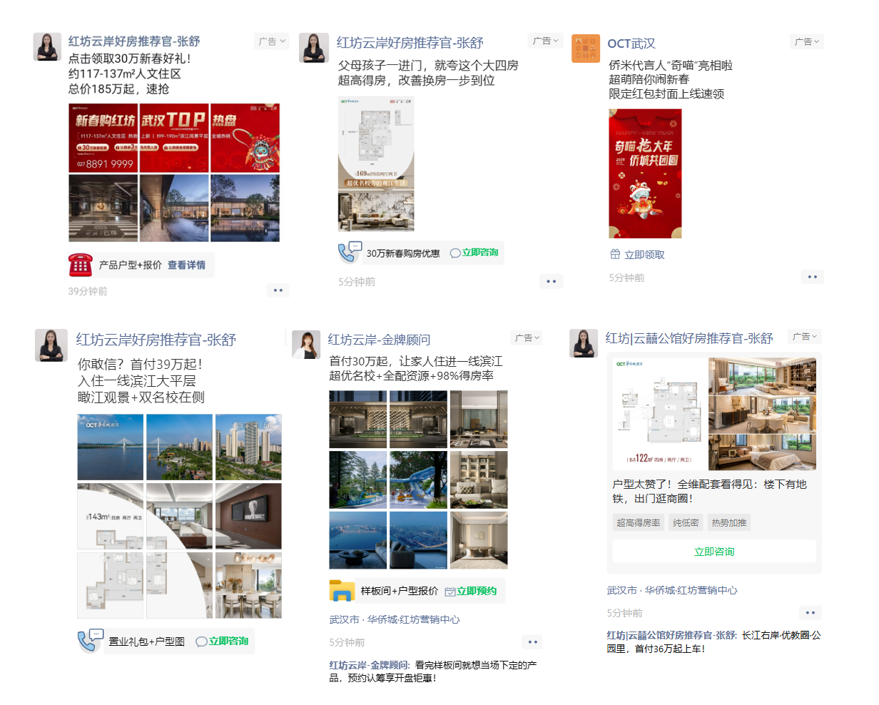 建立 “月度规划、高频迭代”的创意内容中台,确保每月稳定产出 30+套多元化素材。根据洋房、四代高层等产品线差异及各类营销节点(如专属优惠、节日活动),匹配9宫格、竖版视频、信息橱窗等广告形式,同时对项目高质量视频资产进行二次创作,保持沟通内容的高相关性与新鲜度,持续提升点击与留资转化率。