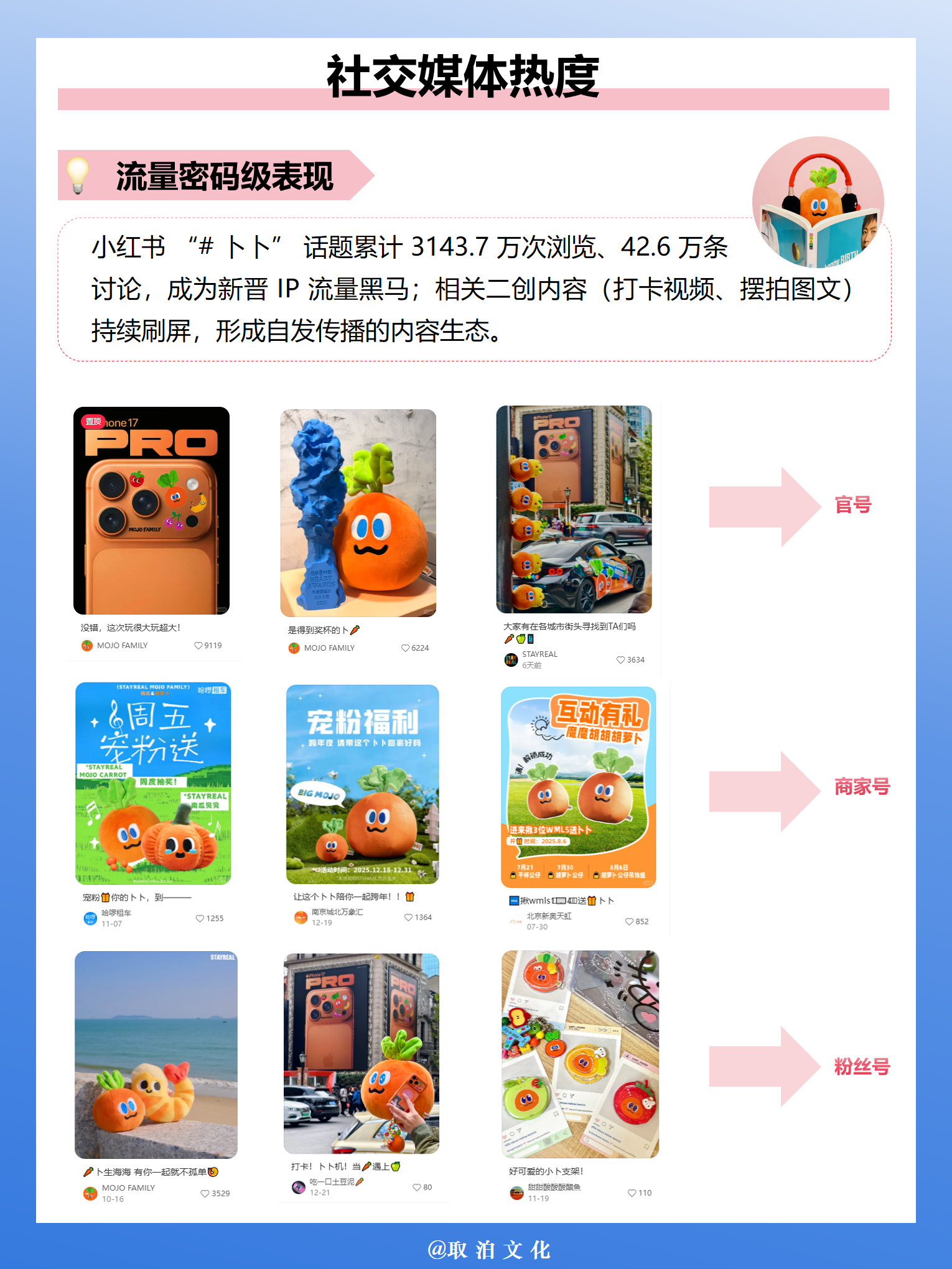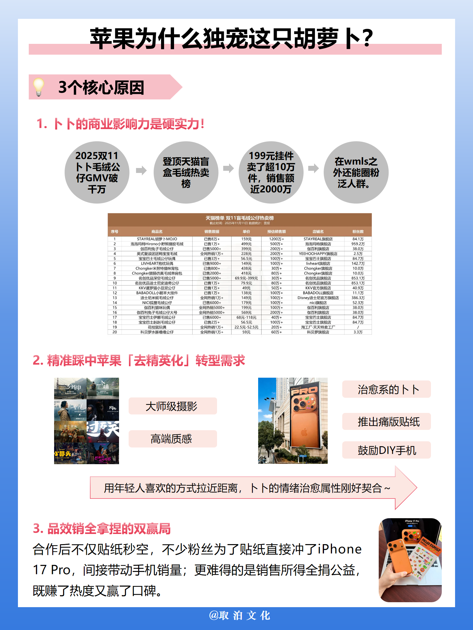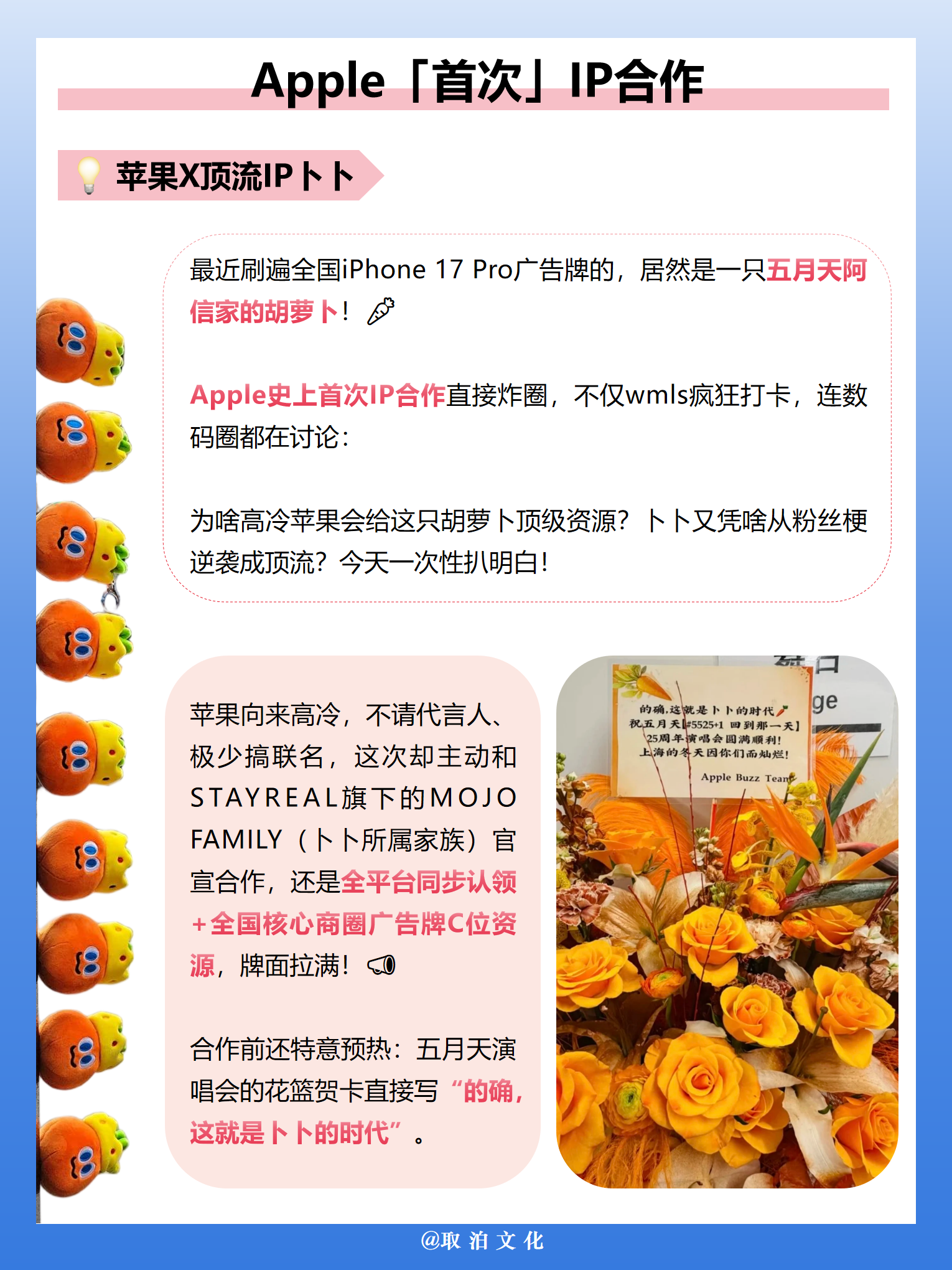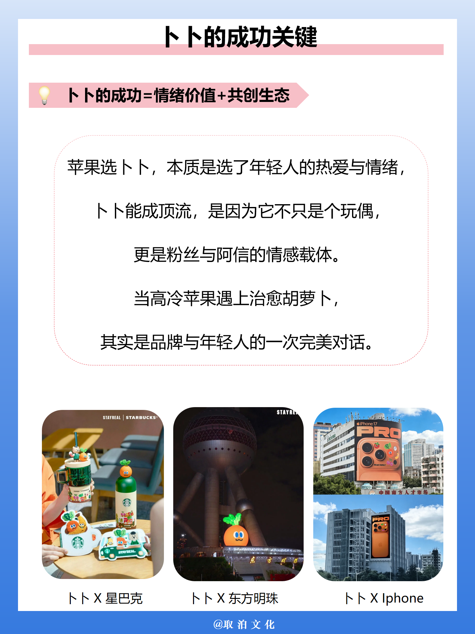 卜卜的成功=情绪价值+共创生态。✅苹果选卜卜,本质是选了大家所热爱。✅卜卜成顶流原因在于它不仅仅是玩偶,更是粉丝与阿信的情感载体。✅当高冷苹果遇上治愈胡萝卜,实际是品牌与年轻人的一次完美对话。你被卜卜可爱到了吗?有没有去打卡这块巨型广告牌呢?微思敦集团,以社交为桥梁、以科技为引擎,助力品牌实现可持续增长,成为全球品牌更值得信赖的社交营销伙伴。