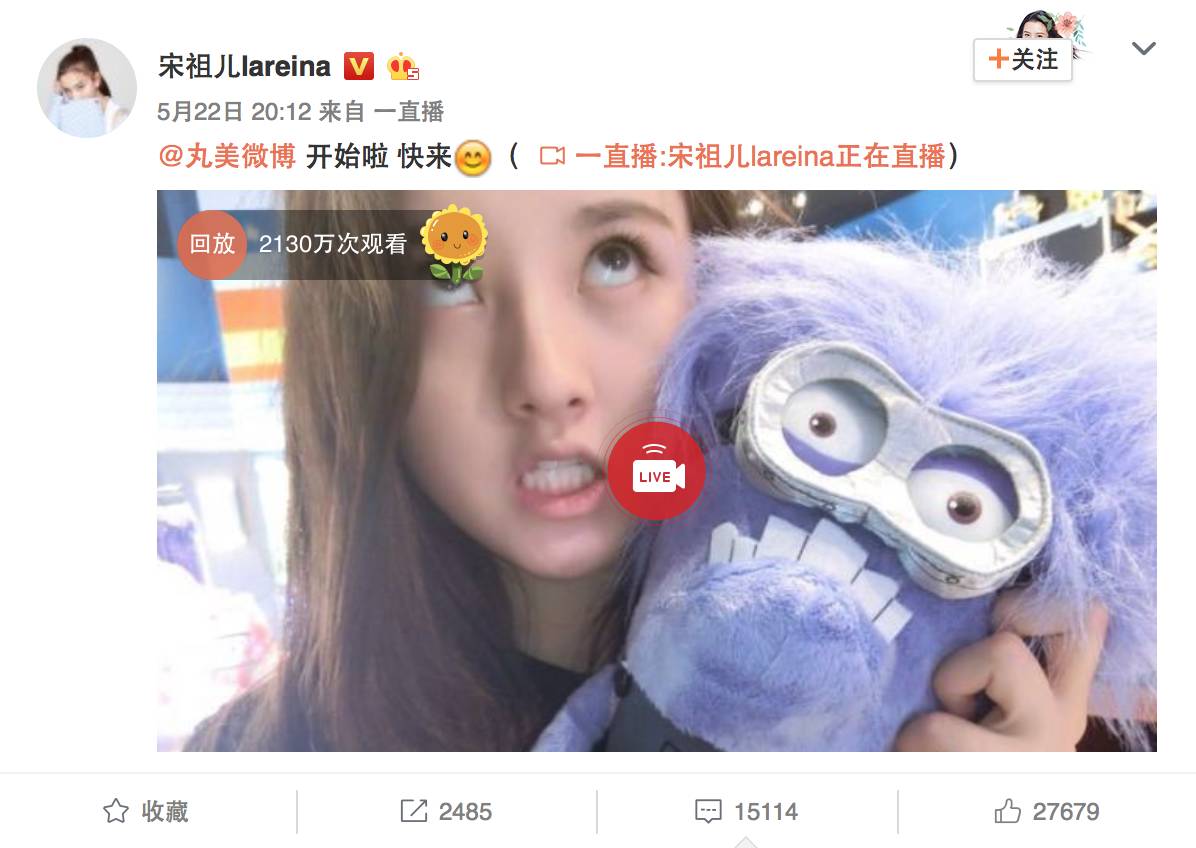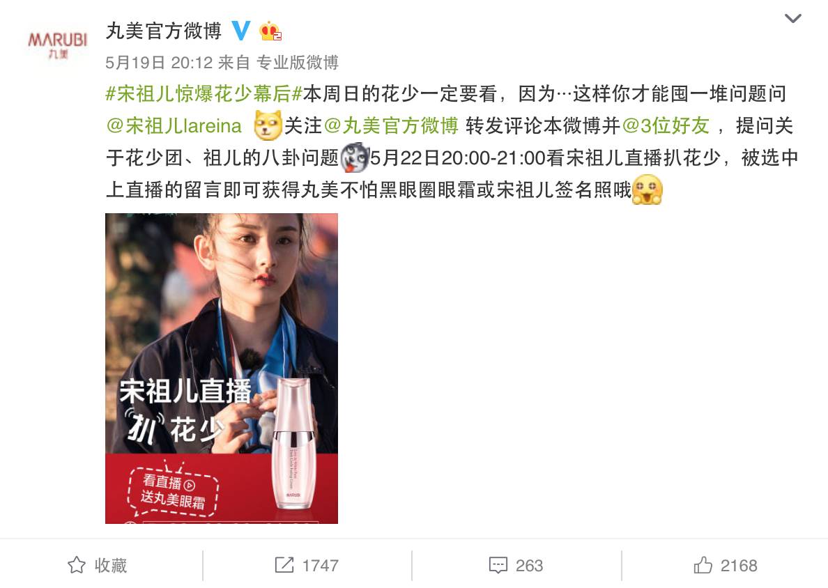 据悉,近日丸美就利用宋祖儿过生日,组织宋祖儿与粉丝直播互动。仅活动预告博文,三天便覆盖620W+精准受众人群,17W+的人参与互动。