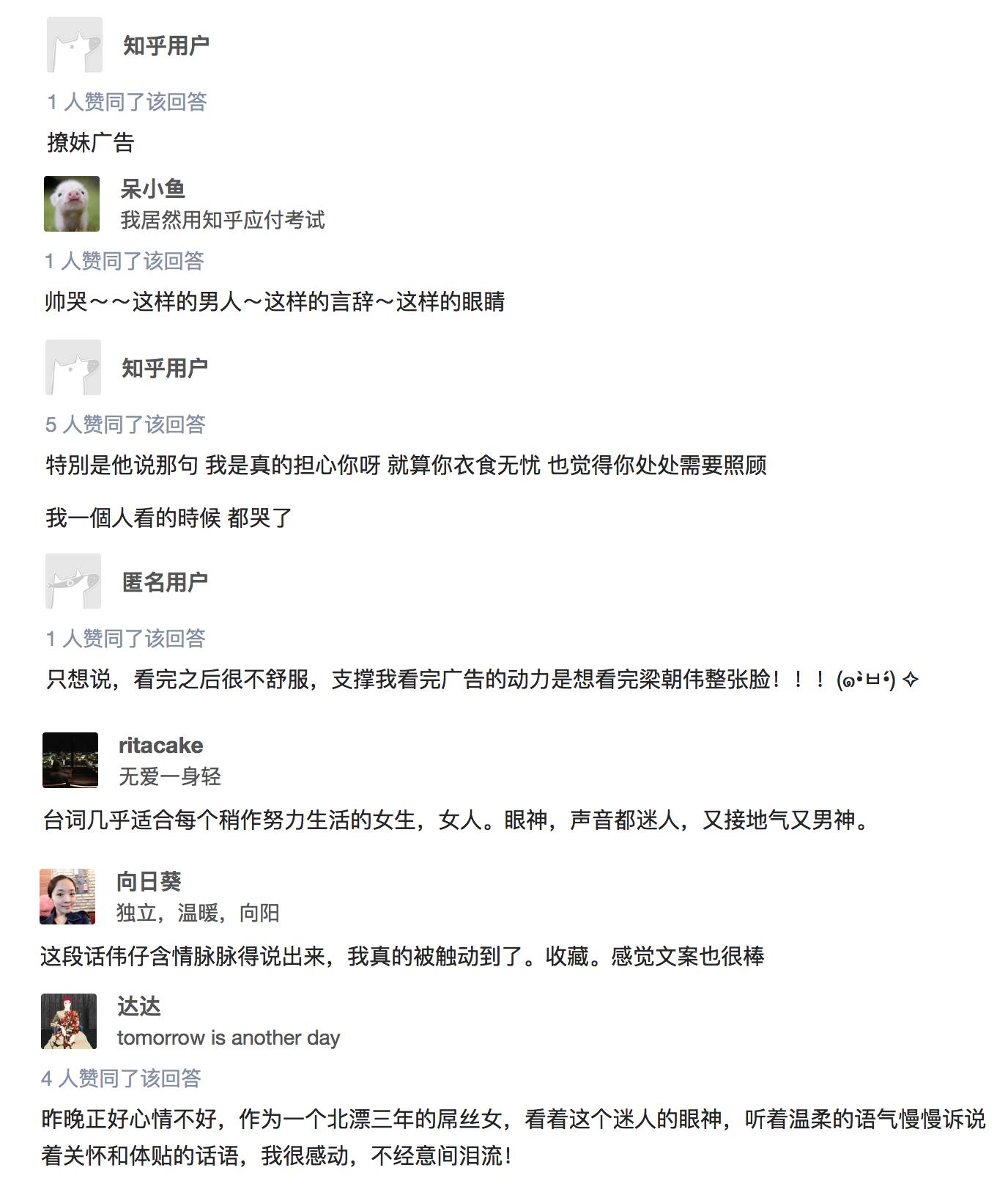 还记得去年刷爆屏幕的梁朝伟丸美《眼》么?三分钟的致命对视,电流十足。梁朝伟那深邃、炙热、迷人的小眼神撩倒了无数的女性,总结知乎网友的评论,简直就是“男默女泪”。纵观此次营销的全过程,不得不说是非常成功。