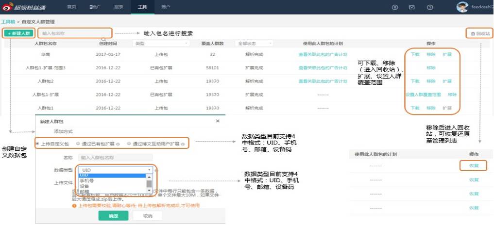 2、自定义数据包:用户可根据自己已有的投放人群创建数据包,进行精准定向投放,数据类型目前支持中格式:UID、手机号、邮箱、设备码。