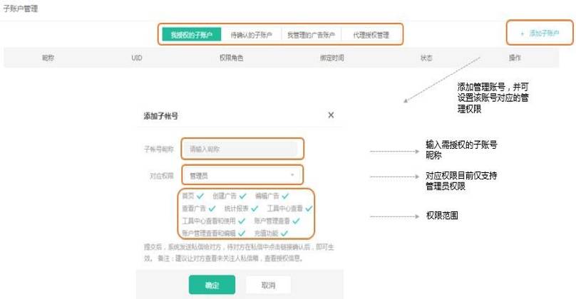 2、子账户管理:添加管理账号,并可设置该账号对应的管理权限(目前仅支持管理员权限)。