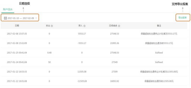 5、账户流水:支出及消耗明细,并支持报表导出。